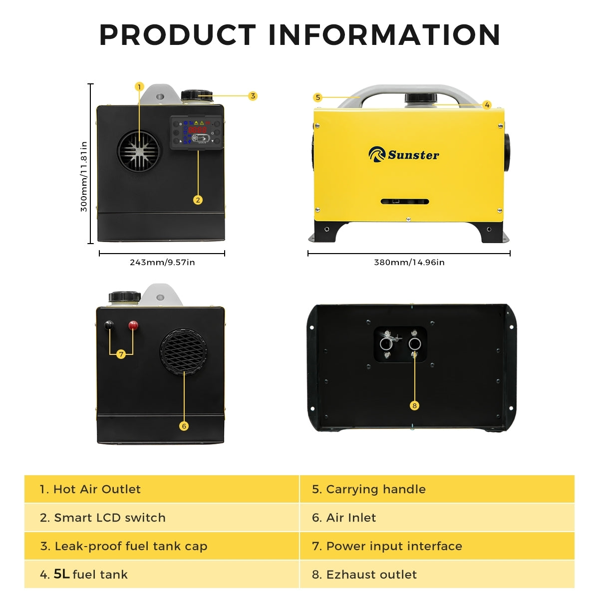 Sunster A2013ST Diesel Heater 8KW 12/24V 110-240V, Plus A2409PW Switch All in One WIFI Bluetooth Version