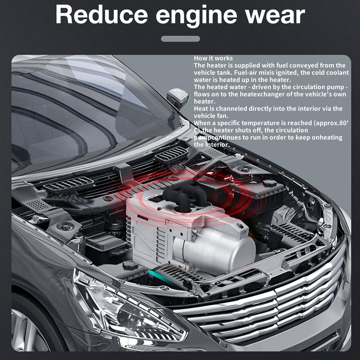 Provides a reliable heat source for your vehicle — warms the cabin, preheats engine coolant, and prevents engine wear in low temperatures. Ideal for defrosting interiors, starting engines smoothly, and clearing frost from windows and mirrors.