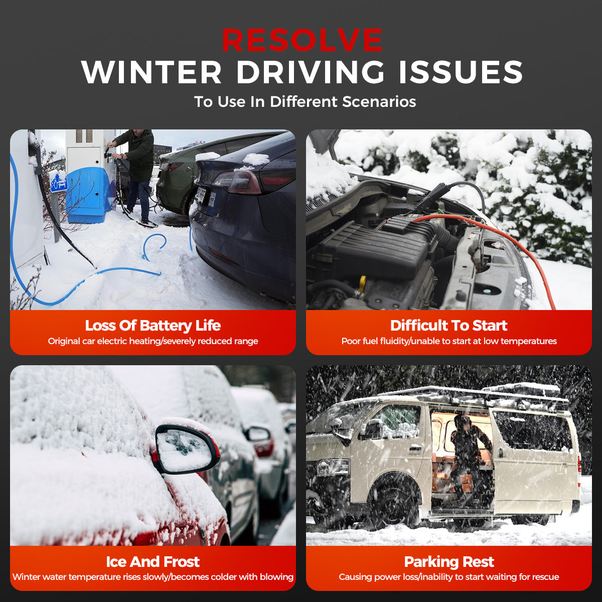 Suitable for a variety of diesel and gasoline vehicles, including cars, trucks, buses, RVs, vans, construction machinery, boats, and more — ensuring warmth and reliability even in extreme winter conditions.