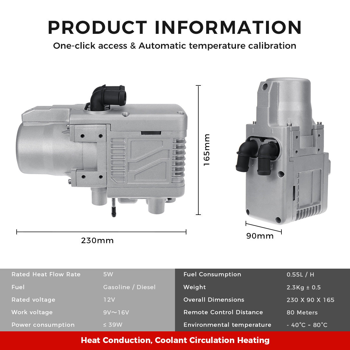 The 5KW heavy-duty coolant heater rapidly warms the water tank and engine, eliminating cold-start issues after parking in winter. With a built-in thermostat, it heats efficiently in as little as 30 minutes for quick comfort and dependable operation.