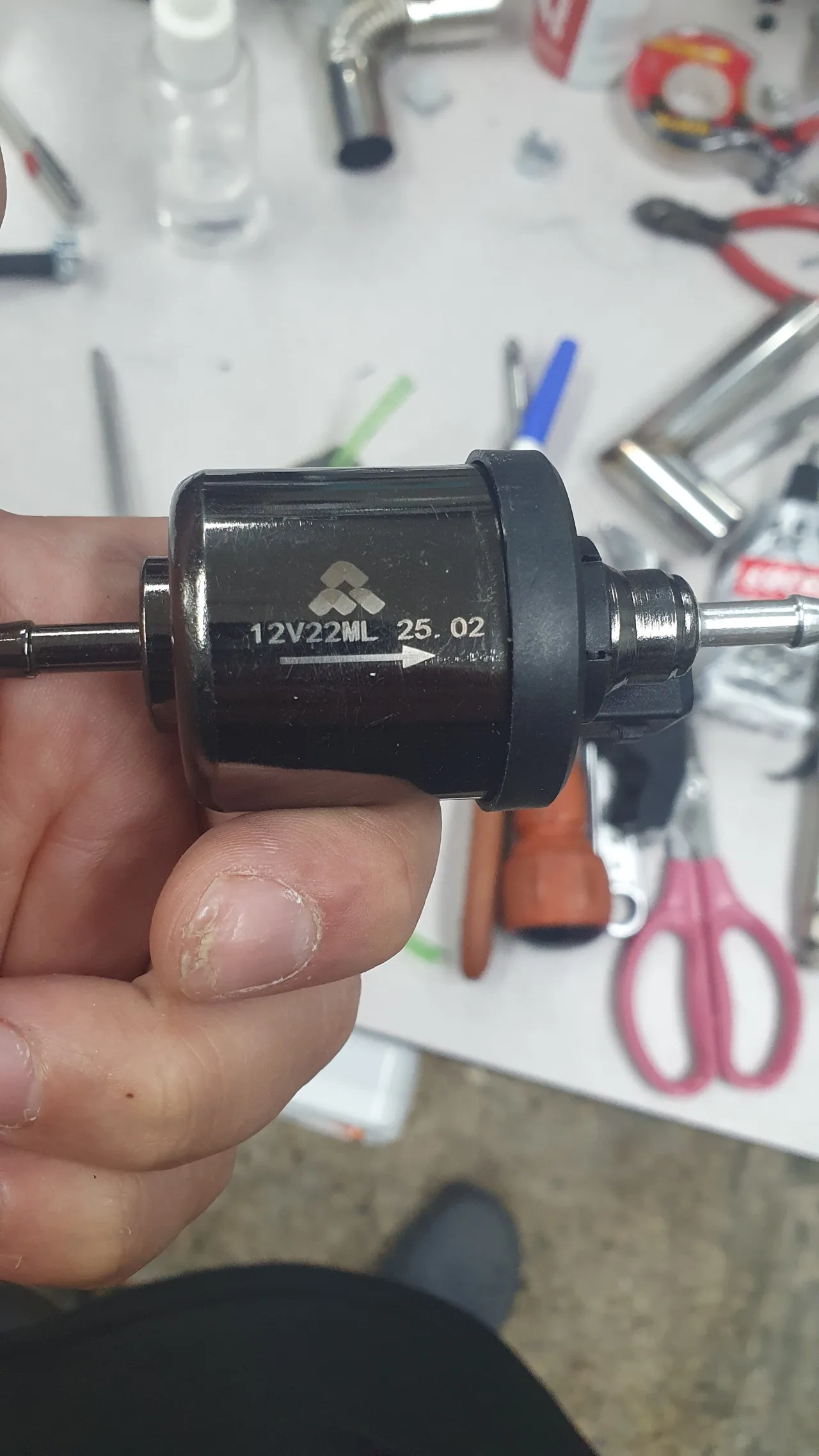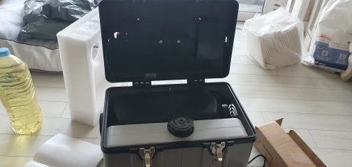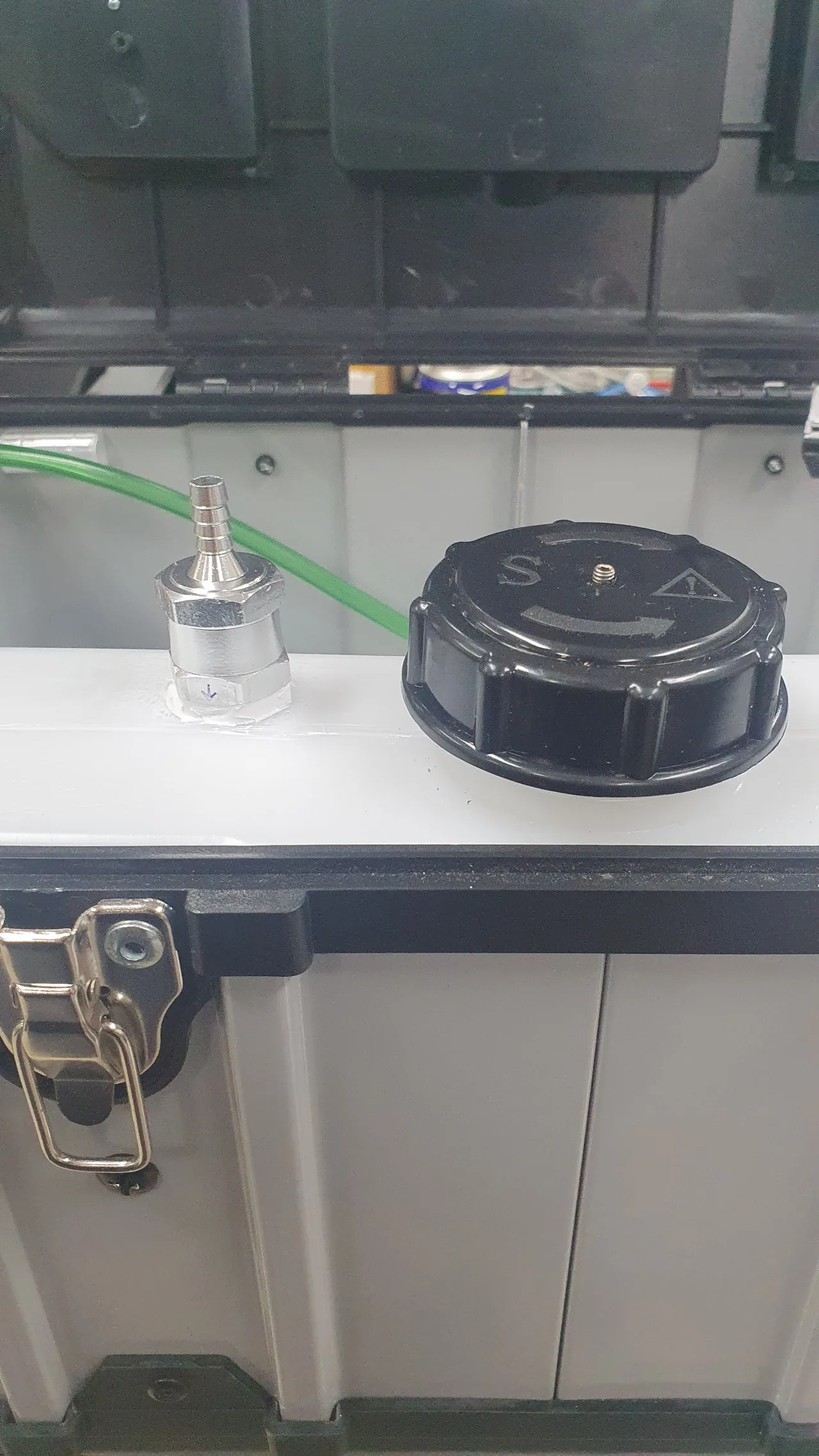 2. Product completeness: As shown in the attached photo, the lid has a function to adjust the oil pressure, so if the box is tilted, oil may leak. However, I solved this issue by installing a check valve (a product that allows oil or air to flow only in one direction). Additionally, we have improved it by drilling a hole in the toolbox and connecting the nozzle from another oil container, allowing for the use of more oil.